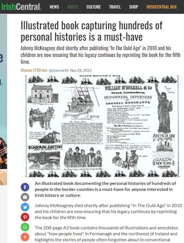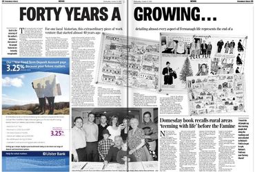 In 1965 Johnny married his wife, Teresa and opened his own grocery shop in Tempo. It was initially stocked for the princely sum of £75 from a trip to a cash and carry in Lurgan. For the next 27 years Johnny ran the "wee shop", which he expanded into a goodly size emporium. But while selling cream crackers and baked beans paid the bills and raised his six children, Johnny found that his fascination with local history and folklore fed the soul. He had learnt as a lad that the North and South Poles had been discovered, that Mount Everest had been climbed and Africa explored. It sounded as if there was nothing more to be discovered. Yet one day a customer named Robbie Woods, born in 1900, came into the shop. He told Johnny where the long-forgotten buttermarket had been in Tempo, and described watching a human chain of men with buckets of water trying without success to stop a raging fire that burned three local houses to the ground.