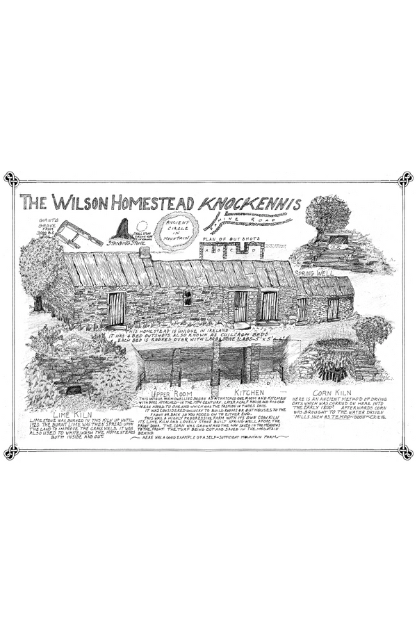 Johnny was hooked. He wrote Robbie's account on a paper bag. In the coming years, Robbie would recount many stories of local life in return for tea and biscuits! Another important influence in his love of folklore was a six month stay on his aunt's farm where he added some farming skills to his CV. He gathered eggs, set potatoes and made rucks of hay. His fondest memory of these days is the big blazing hearth fire at day's end. The family would gather round to tell stories and play cards. It was the 1970s. Disco ruled. Starsky and Hutch were king. But the rural life drew Johnny. Realizing that there was physical history all around him that was slowly vanishing, he decided to document the local abandoned farmsteads and outhouses. He'd stroll out and sketch the dimensions. He quickly learned a few rules of thumb. If a house had an iron roof, then it would have been thatched in earlier days. If there was no roof, he'd search for a discarded piece of slate nearby. It took hours to figure out how the house might have looked in its prime and sketch it with the original roof. Lacking formal art training, Johnny was encouraged to continue his recordings by Mr Leslie Stewart, who taught art at the Technical College.